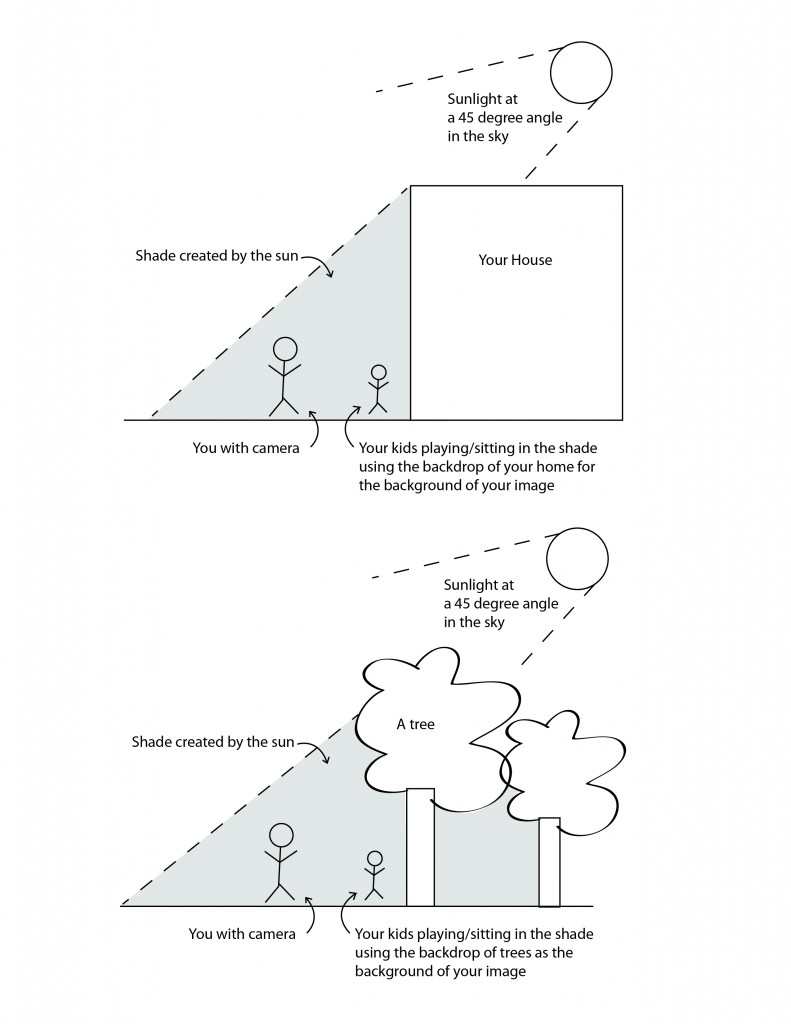 The second thing for this post is to find open shade. We may get into more advanced topics on changing your camera settings but for now I’m guessing everyone is just using auto mode so I’m helping you use that mode to the best. Auto mode on your camera will work wonderfully in open shade or shady areas of your yard/park/favorite outdoor location. Open shade can be the shade of a tree, building, porch or other structure where your kids are standing/playing/sitting in shade while still allowing plenty of sunlight to illuminate your kids. When outside using the shade of trees the one thing you have to watch out for is sun spots filtering through trees and hitting your kids on the head or face, try to move them around so that there are no sun spots on them since they can ruin your images. Also at this point in your learning make sure there is not any sun coming in from behind your kids. Keep them under or near a few trees so that there is a lot of shade behind the tree as well. See the illustrations below that I drew to help you understand with a visual. Don’t mind the stick people. 😉