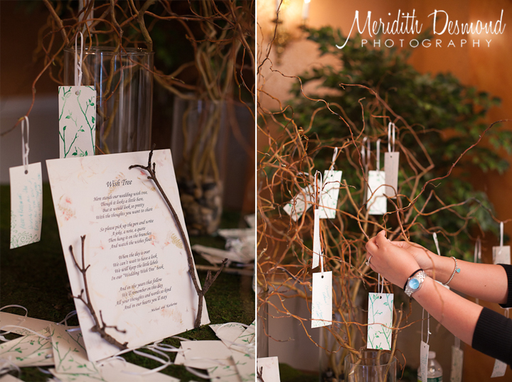 Katherine and Mike set up a wish tree where instead of a traditional guest book all of their guests wrote out their wishes to the bride and groom, then hung them onto the tree branches. What a clever and different idea!