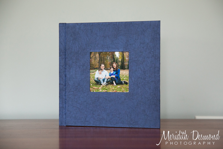 A 4×4 inch photo is inset onto the cover, the cloth material can enhance the colors in your images.  They chose a textured blue fabric to compliment their outfits, which I love!